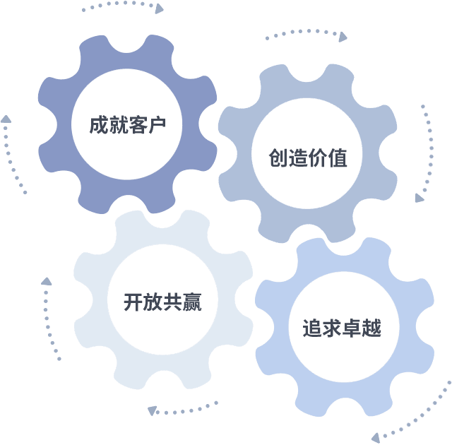 成就客户是一切决策的出发点,,,创造价值是衡量所有工作的标准,,追求卓越是我们做事做人的态度,,开放共赢是我们的格局也是最终的结果。。。。价值观的齿轮环环相扣,,,推动着组织里的每个人不断向前。。